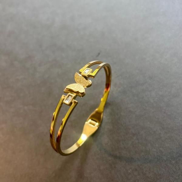 The 2 Golden Butterfly Bangle Bracelet is a stunning, elegant piece of jewellery featuring two beautifully crafted butterfly motifs, each intricately designed to capture the grace and delicacy of nature. The butterflies are set along a smooth, polished gold-tone bangle, creating a sophisticated and timeless look. The golden finish adds a touch of luxury and warmth, making this bracelet perfect for both casual and formal occasions. The butterflies are often embellished with fine details, such as subtle engraving or small gemstones, enhancing their charm. This bracelet is ideal for those who appreciate refined, nature-inspired designs and want to add a touch of elegance to their ensemble.