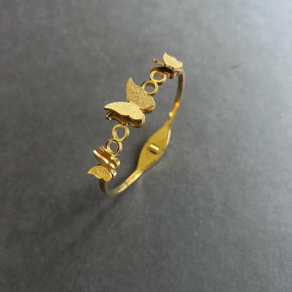The 3 Golden Butterfly Bangle Bracelet is a stunning and elegant piece of jewelry that features three beautifully crafted butterfly motifs, each intricately designed to capture the grace and delicacy of nature. The butterflies are set along a smooth, polished gold-tone bangle, creating a sophisticated and timeless look. The golden finish adds a touch of luxury and warmth, making this bracelet perfect for both casual and formal occasions. The butterflies are often embellished with fine details, such as subtle engraving or small gemstones, enhancing their charm. This bracelet is ideal for those who appreciate refined, nature-inspired designs and want to add a touch of elegance to their ensemble.