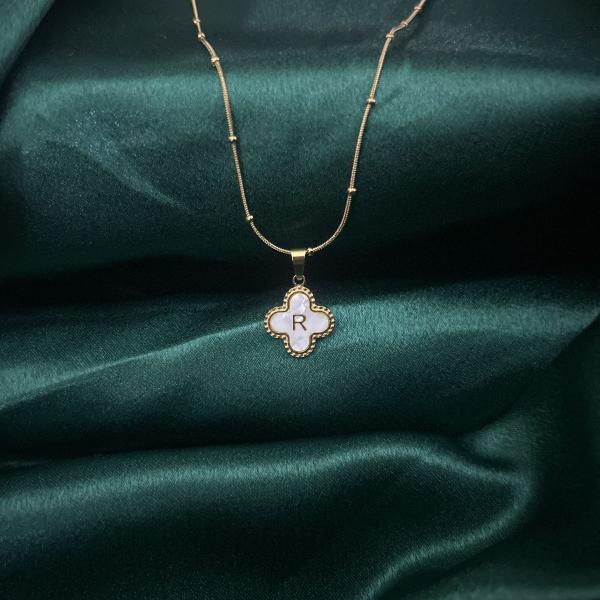 Introducing our must-have 18KT Gold Plated Reversible Clover Alphabet Necklace! With a cute alphabet design on one side and a golden clover on the other, this necklace is both dainty and versatile. The mother of pearl like accent adds a unique, holographic touch. Plus, it's waterproof and tarnish-free for everyday wear. Get yours now!