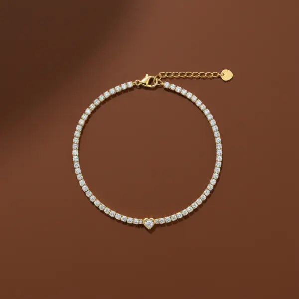 Wear your heart on your wrist 💖 This stunning heart tennis bracelet features a row of sparkling crystal stones in a classic tennis silhouette, elevated with a romantic heart-shaped design. Perfect for everyday wear or gifting to someone special. Gold plated with anti-tarnish finish, lightweight, and adjustable for a comfortable fit all day long.
