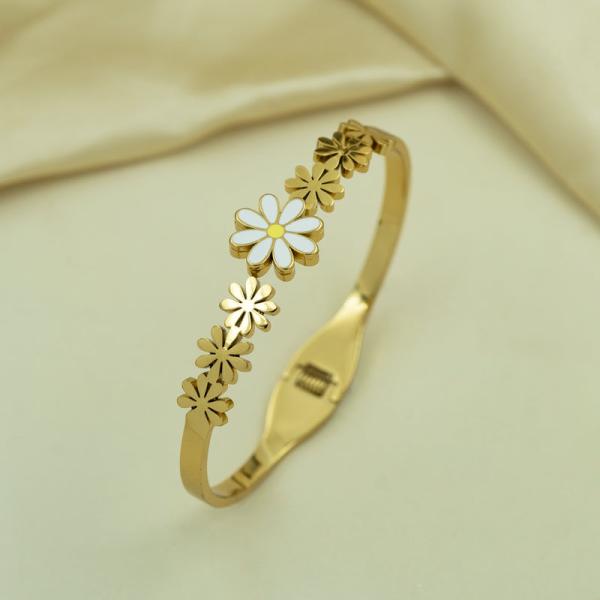 “Add a fresh and cheerful touch to your jewellery collection with the Dreamygems Gold Daisy Floral Bracelet. Designed with multiple delicate daisy flowers and a charming white center floral detail, this bracelet brings a soft, elegant and feminine look to your wrist. Its open kada design offers a comfortable fit and allows easy pairing with other jewellery or watches. The polished gold finish makes it ideal for casual outings, office wear, festive events, and special occasions. This floral bracelet is perfect for women who love minimal yet detail-rich accessories and makes a thoughtful gift for birthdays, anniversaries, Valentine’s Day, and other celebrations.